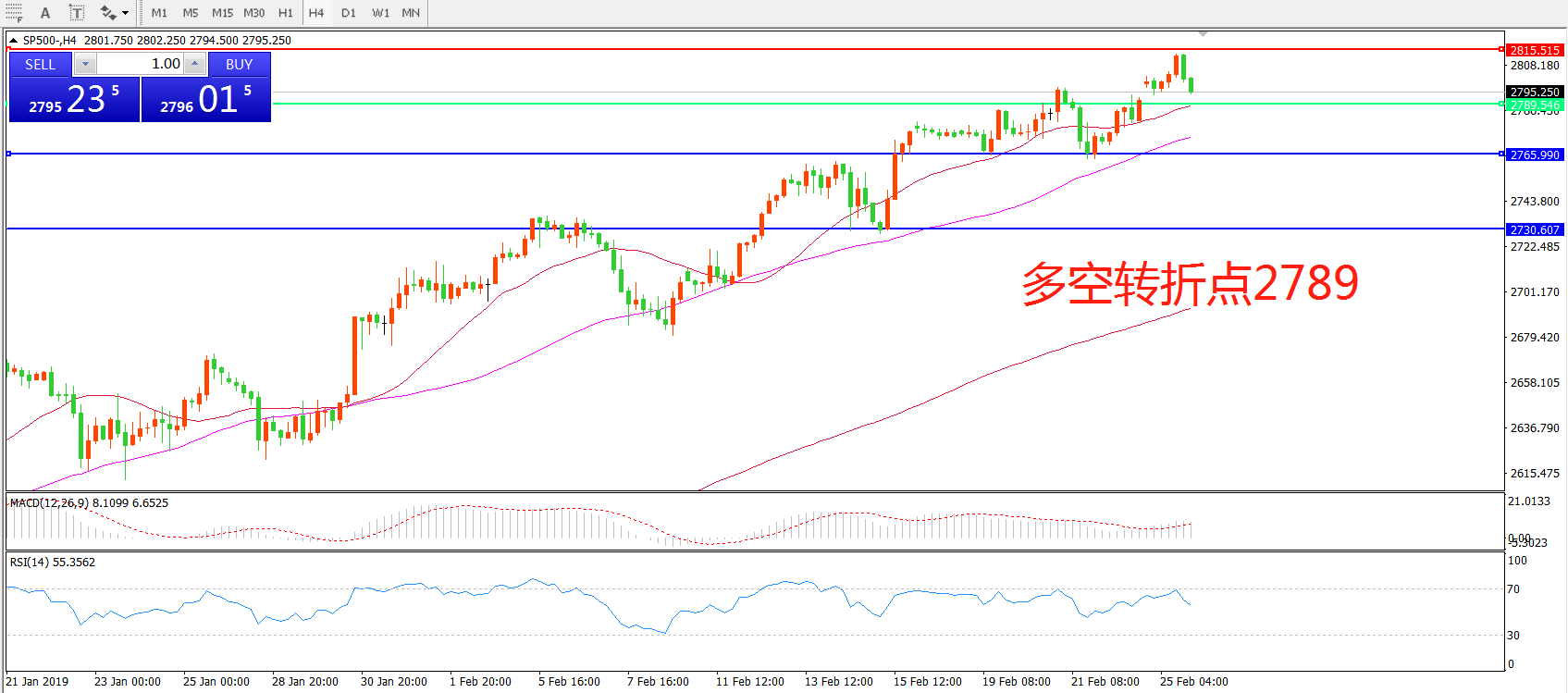 4小时图看,SP500高位震荡后呈现明显的上升趋势状态,21均线成为下方短线支撑,MACD红柱走平,RSI指标掉头,短期有回调风险,但整体依然维持多头思路。