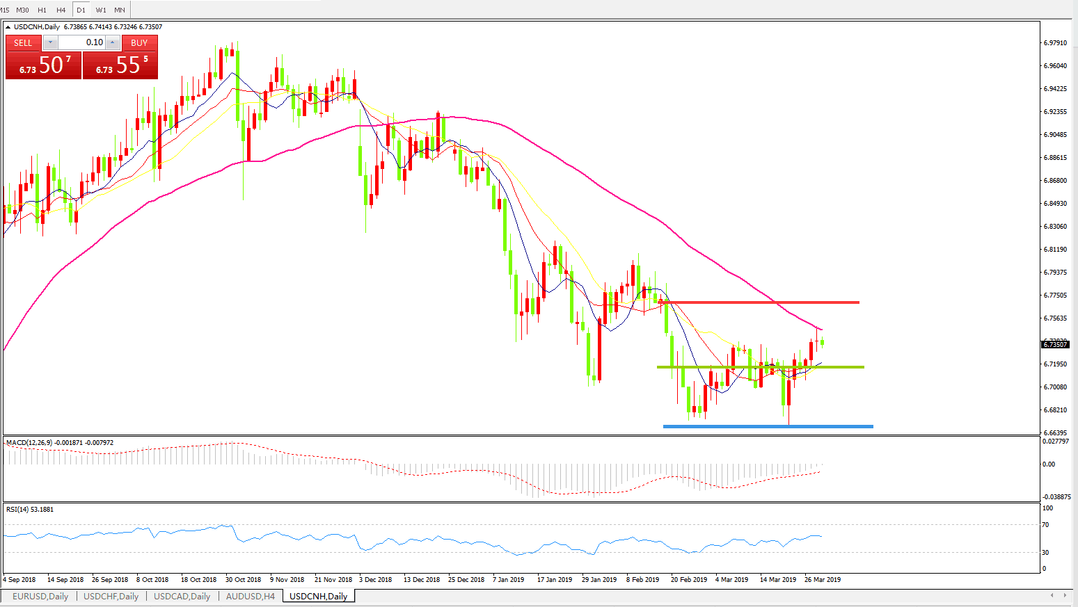 交易策略: 在6.6990之上,看涨,目标价位为6.7845,然后为6.8185。