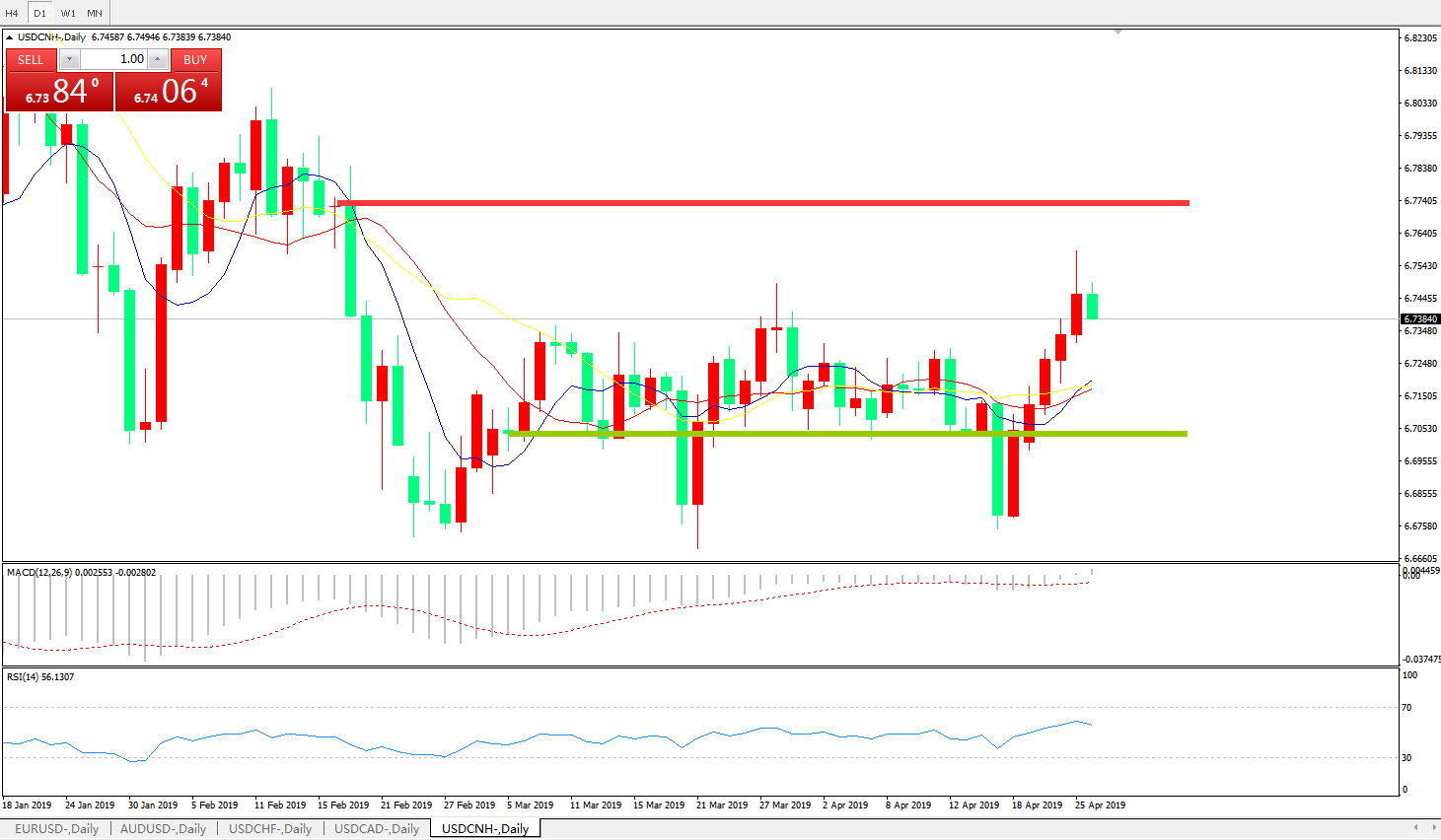 交易策略: 在6.6990之上,看涨,目标价位为6.7845,然后为6.8185。