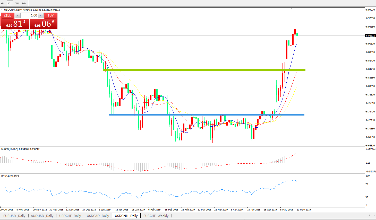 技术面简析:日线图均线呈有序多头排列看多,MACD在0轴上方运行且动能柱0轴上方持续放量,RSI超买区域有下行迹象,汇价强力上攻后维持整理态势,预计短期汇价有进一步上行空间,中期重点关注中美贸易争端后续进展。