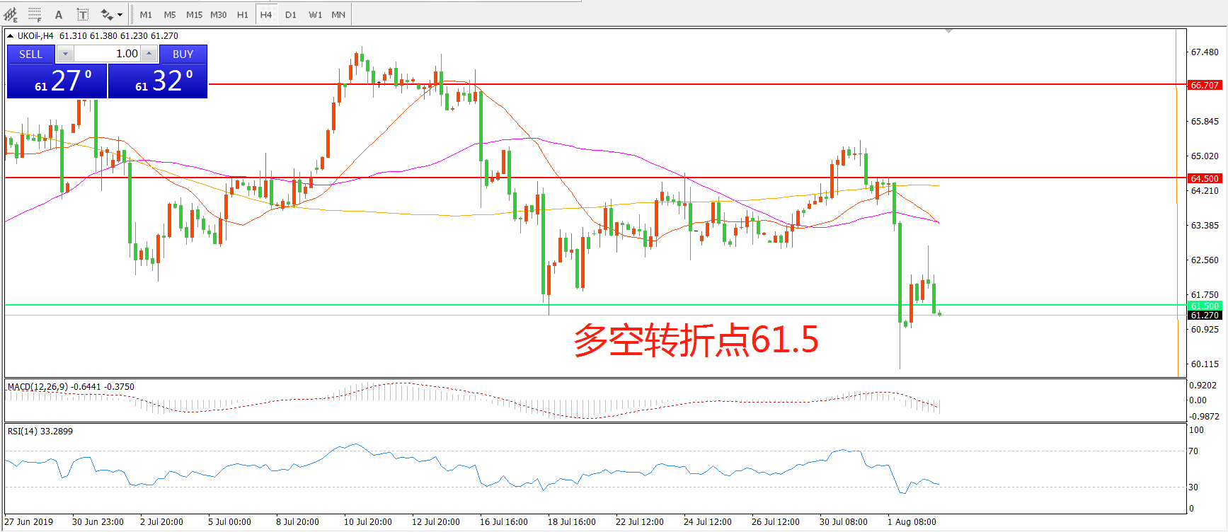 4小时图看,油价跌破61.5一线支撑后小幅反弹,但整体表现仍然弱势,MACD绿柱增加, RSI指标拐头走平,日内延续震荡概率较大。