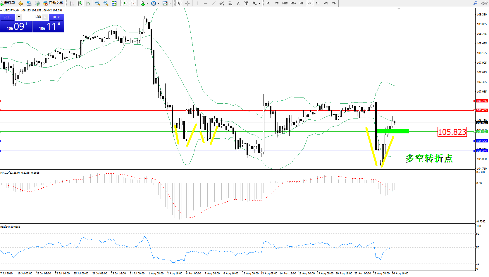 备选策略:105.823下方看跌,目标105.542、105.244