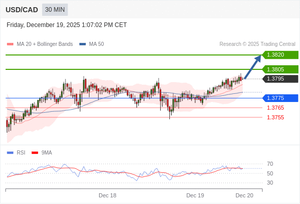 在 1.3775 之上,看涨,目标价位为 1.3805 ,然后为 1.3820 。