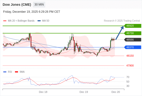 在 48370 之上,看涨,目标价位为 48730 ,然后为 48920 。
