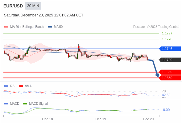 欧元/美元 当日内 : 看跌,在 1.1746 之下。