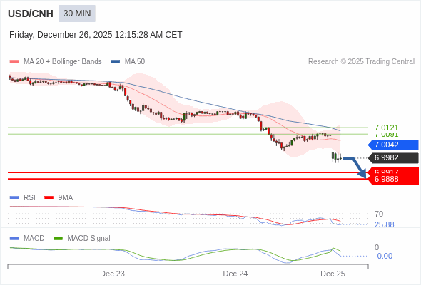 技术点评: RSI技术指标小于30。在这种情况下,说明有很强的下跌趋势,或者意味着处在超卖的状态下,可能会有向上的反弹。我们将观察RSI技术指标是否出现背离现象。 MACD技术指标处在其信号线之下看空。 配置为负。 此外,价位低于其20天及50天移动平均线 ( 分别位于7.0062 和7.0105 )。 最后,价位跌破其布林线通道下轨 (位于6.9988。