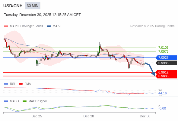 美元/人民币 当日内 : 看跌,在 7.0027 之下。