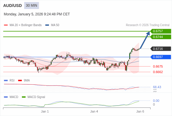 澳元/美元 当日内 : 看涨,当 0.6697 为支撑位。