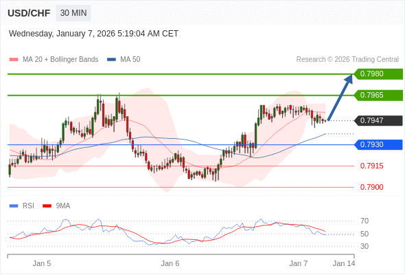 美元/瑞郎 当日内: 在0.7930之上,看涨。