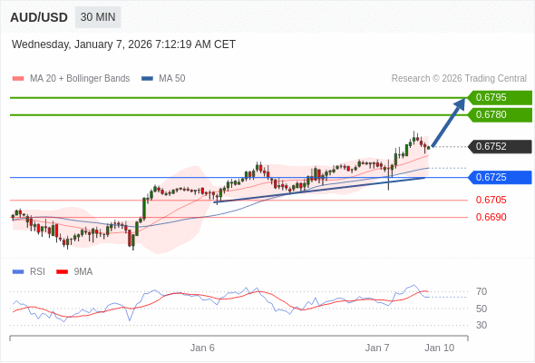 澳元/美元 当日内: 目标位为0.6780。
