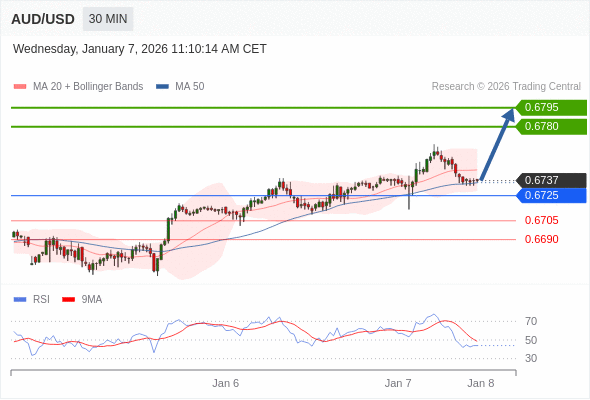 在 0.6725 之上,看涨,目标价位为 0.6780 ,然后为 0.6795 。