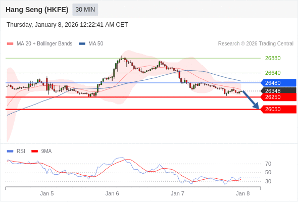 香港恒生指数期货 当日内: 朝26050运行。