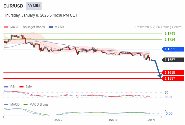 欧元/美元 当日内 : 看跌,在 1.1692 之下。
