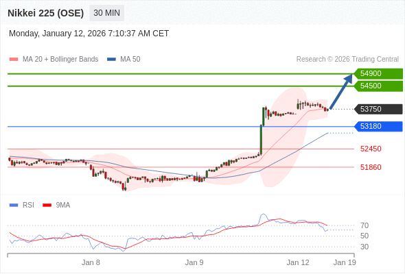 日经225股指期货 (OSE) 当日内: 在53180之上,看涨。