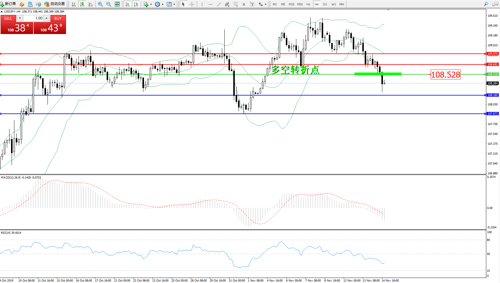交易策略:108.528下方看跌,目标108.180、107.873