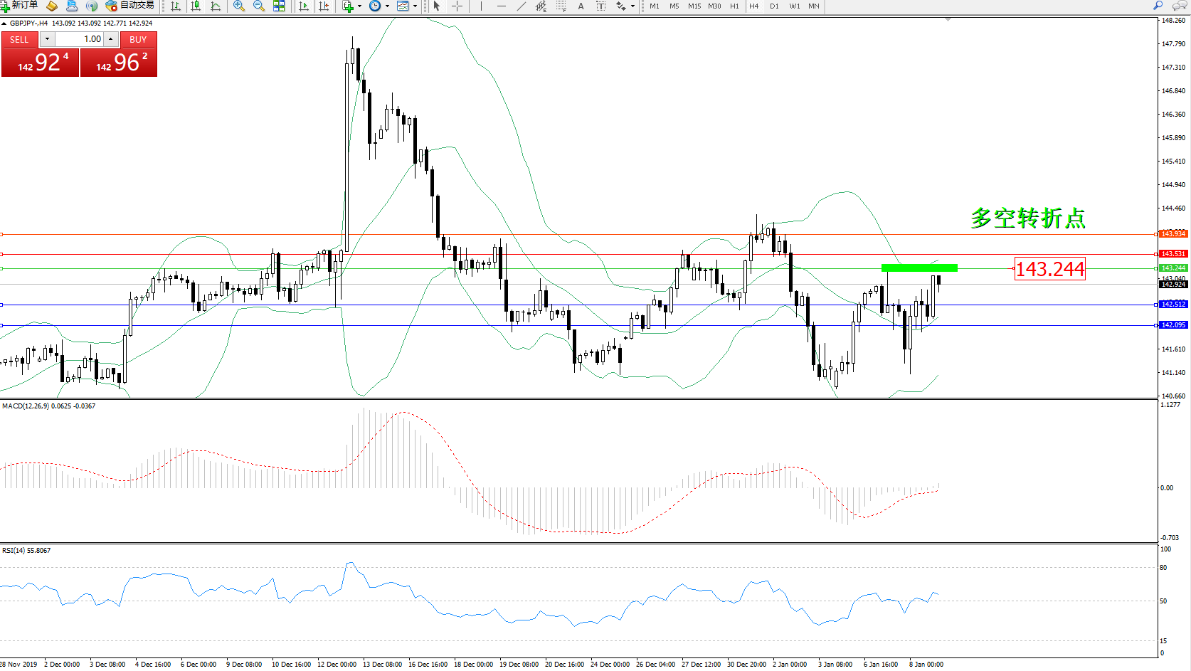 备选策略:143.244上方看涨,目标143.531、143.934