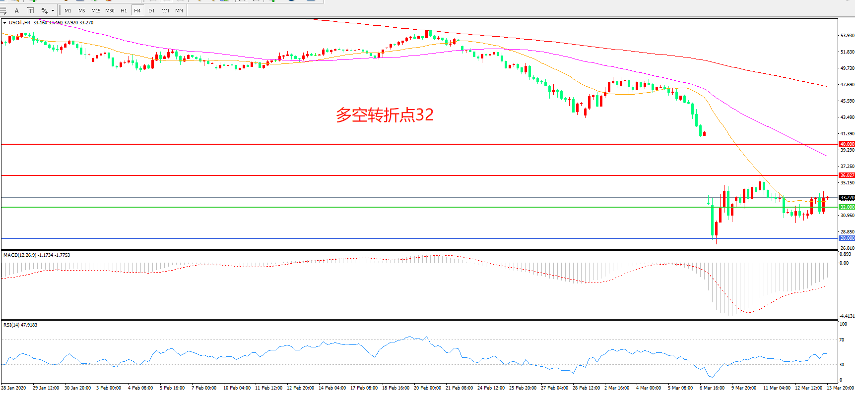 4小时图看,美油延续低位震荡,整体波幅不大,32美元成为短期多空分水岭,均线系统呈空头排列,MACD绿柱减少,RSI指标走平,延续震荡概率较大,短期反弹有望出现,中期走势仍然偏空。