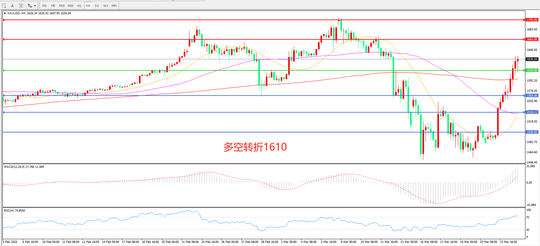 过去一天内特朗普、努钦、佩洛西、舒默等两党高层多次表态称“协议接近达成”。 除此之外,特朗普还与华尔街顶级投资者及对冲基金高管举行电话会议.连续不断地“救市”措施拯救了市场信心,加上世界上最大的三家黄金炼厂表示,受疫情影响,他们已暂停在瑞士的生产至少一周,供需矛盾将持续支撑金价上行。