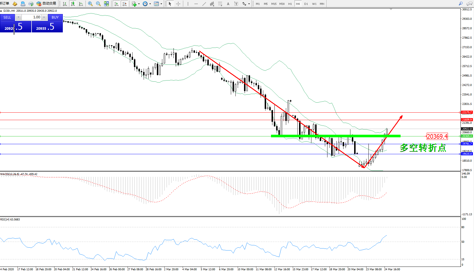 道琼斯指数324日(周二)收盘上涨2113.00点,涨幅11.37%,报20704.91点。欧美股市暴涨,道指涨逾11%,创下1933年以来的最大单日涨幅。美国国会接近达成史无前例的经济刺激法案,推动风险偏好急剧升温。正在协商规模约2万亿美元抗疫刺激法案的最后症结。美国股市对这一庞大的财政刺激前景以及两党谈判进展做出反应。被迫抛售的绝对疯狂可能已经结束,现在有将近一万亿美元的资金等待流入股市。市场情绪有所回暖,但现在称之为拐点还有些过头,这更像是一场拉锯战。刺激政策火箭炮已经到位,将与非常疲软的经济数据和令人担忧的疫情趋势作战。投资者等待美国参议院通过经济刺激法案,以缓和新冠病毒扩散对经济的冲击,且美国总统特朗普敦促美国在4月中前重新恢复经济活动。