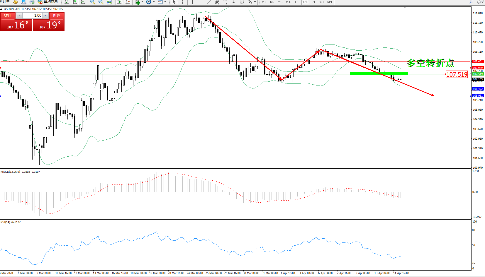 交易策略:107.519下方看跌,目标106.472、105.991