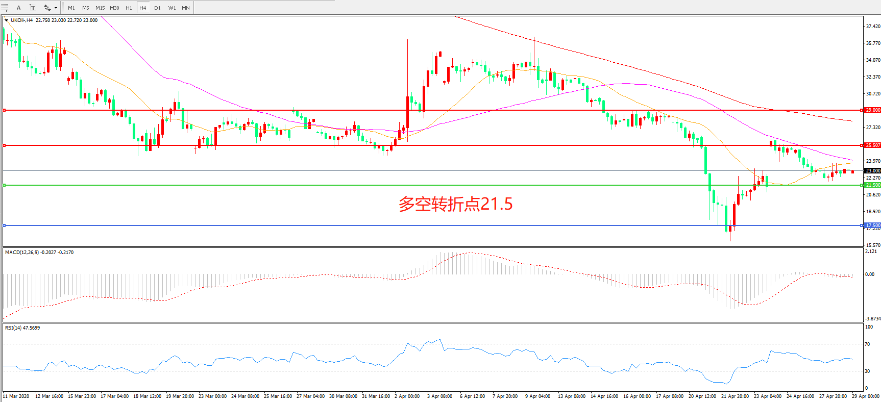 4小时图看,油价延续低位震荡,整体表现偏弱,55周期均线成为短期阻力,21.5成为下方支撑,MACD红柱增加,RSI指标走平,日内延续震荡概率较大。