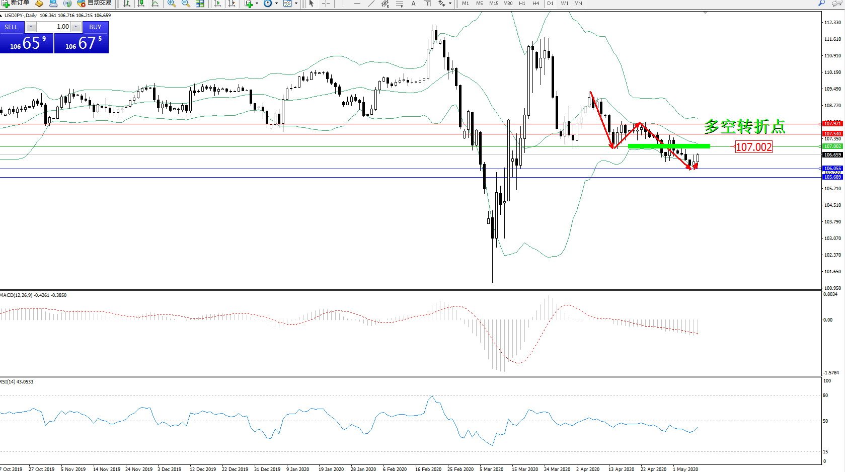 交易策略:107.002下方看跌,目标106.055、105.689