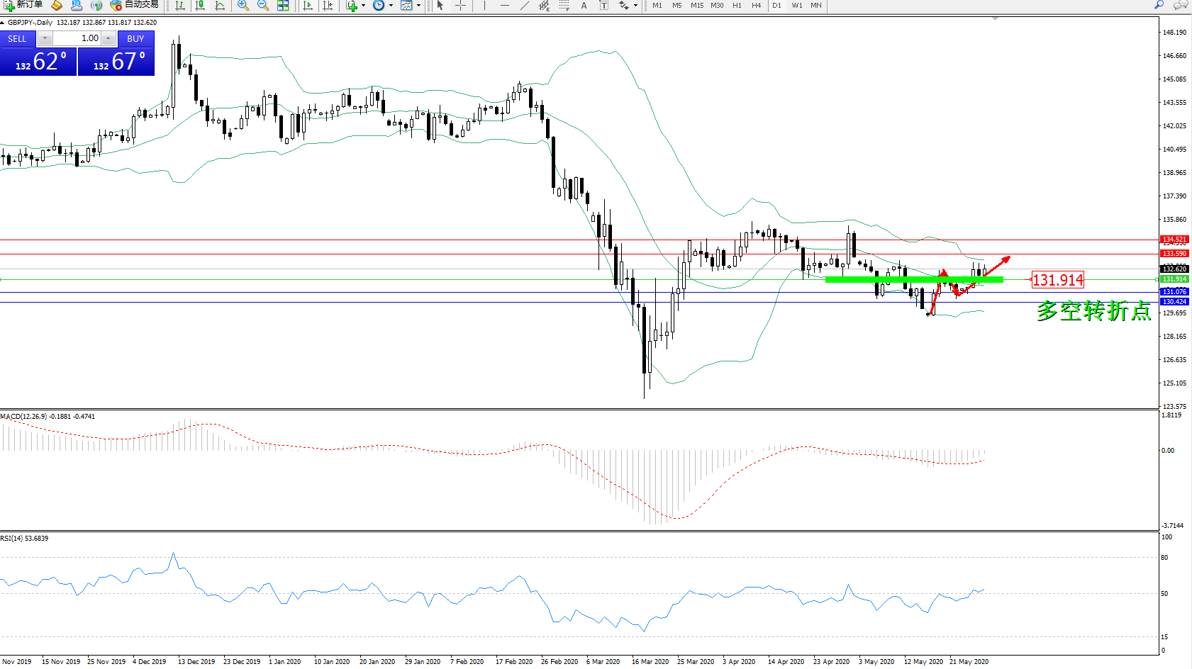 交易策略:131.914上方看涨,目标133.590、134.521