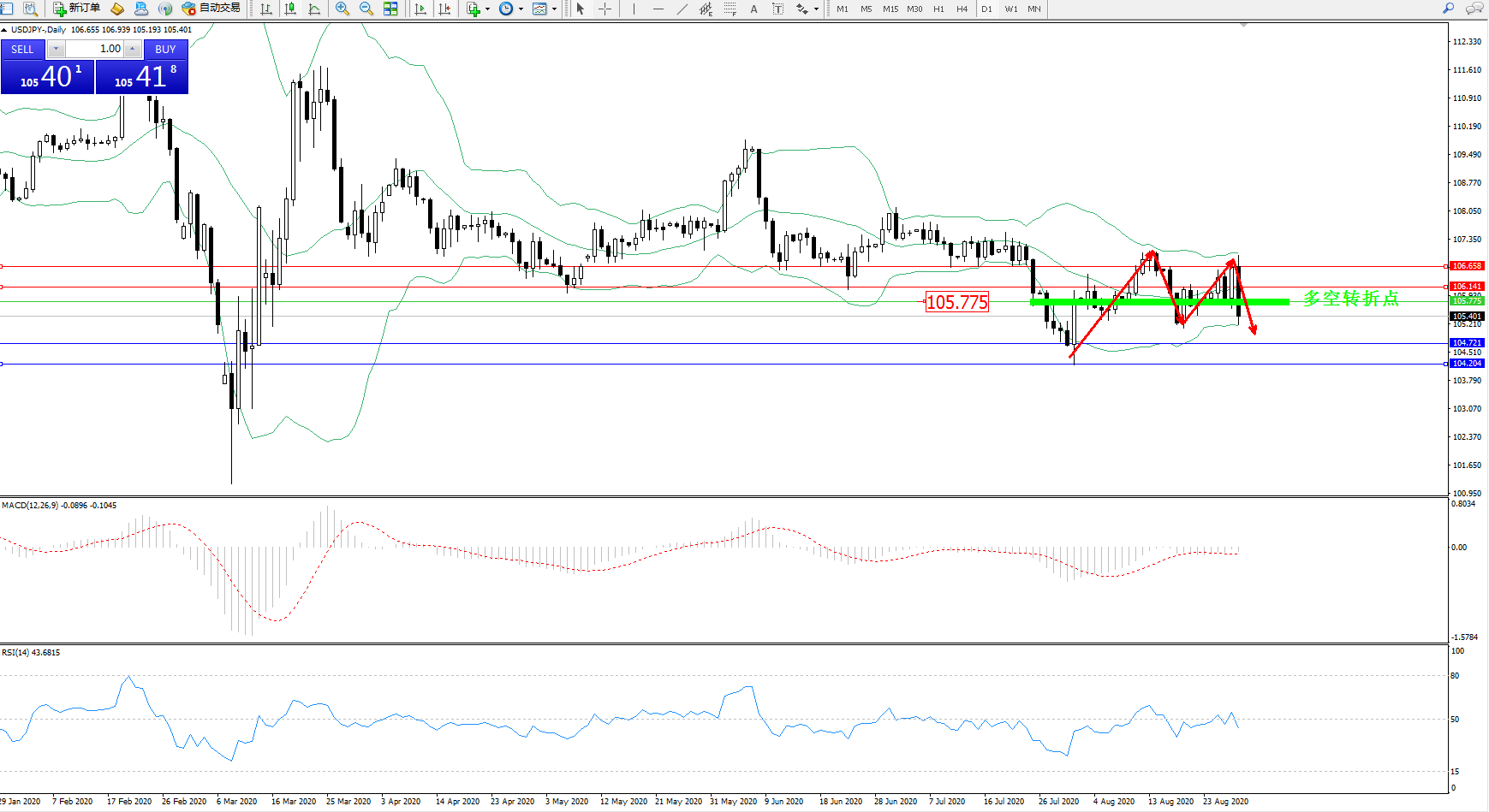 交易策略:105.775下方看跌,目标104.721、104.204