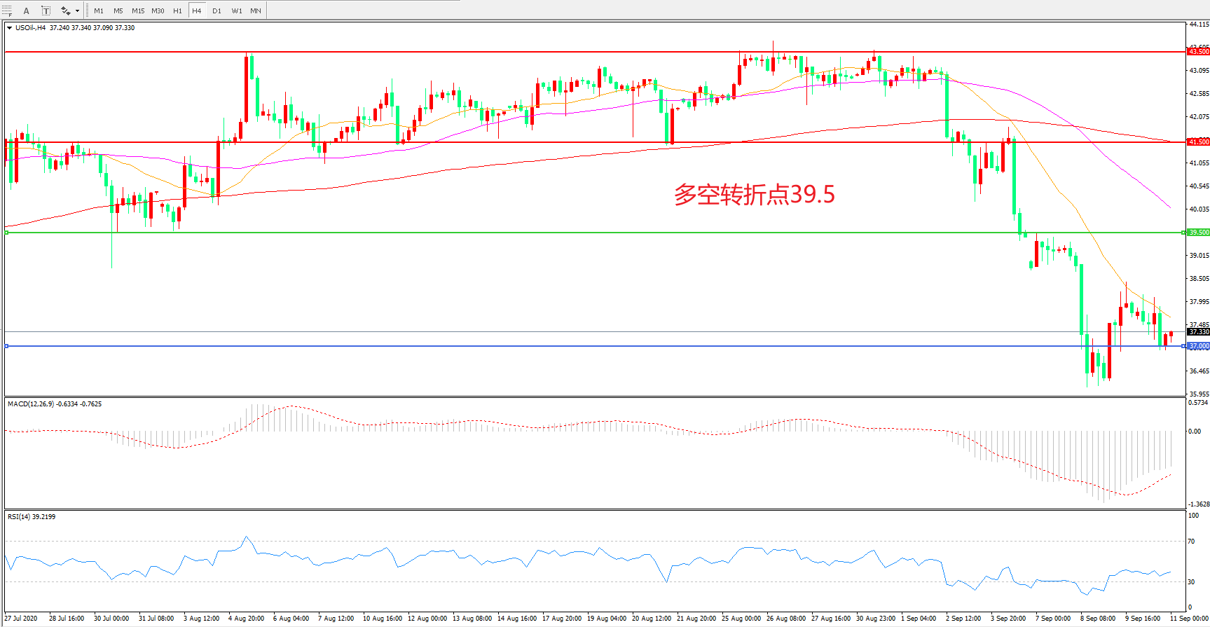 4小时图看,油价冲高回落,整体走势偏弱,21周期均线成为短期阻力,37美元成为短期支撑,MACD绿柱缩短,RSI指标走平,日内延续震荡概率较大。
