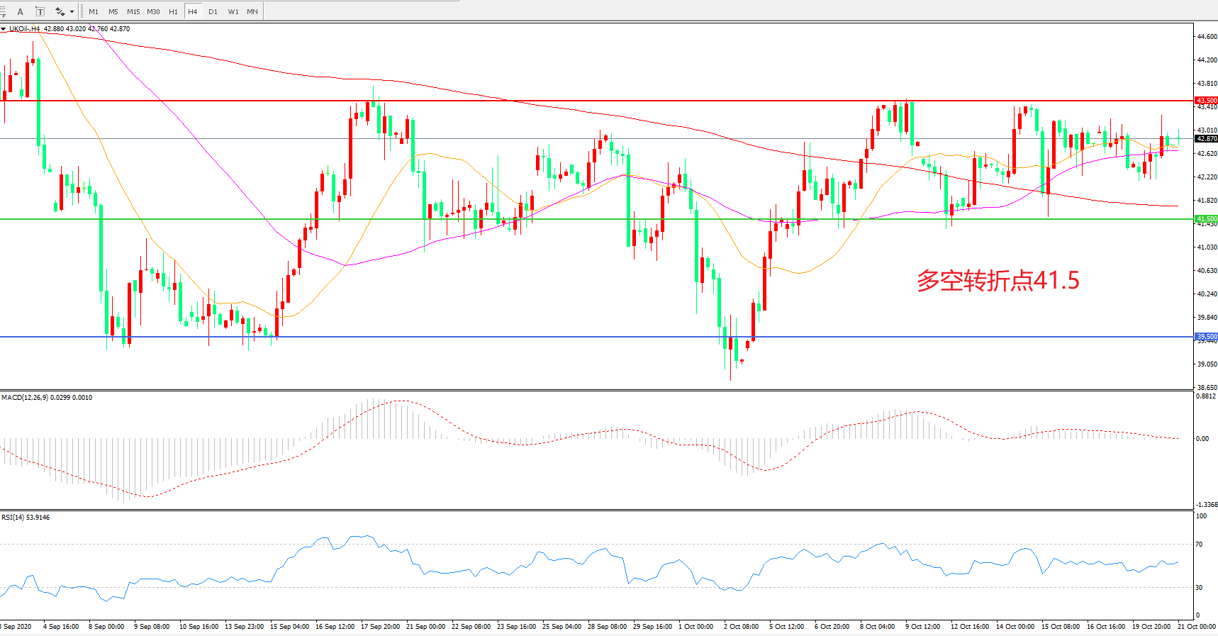 4小时图看,油价以21周期均线为依托震荡上行,整体表现有所回暖,43.5成为短期阻力,MACD红柱增加,RSI指标走平,日内延续上行概率较大。