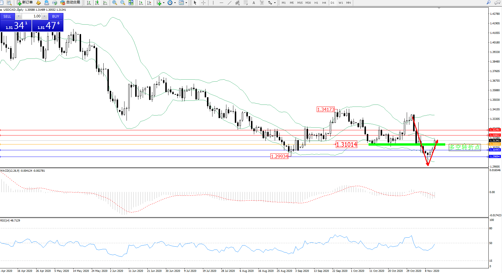 美元加元USDCAD——日K线图显示: