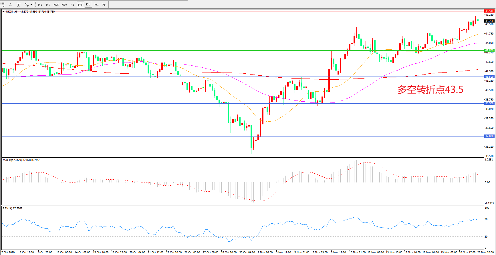 4小时图看,油价延续高位震荡,低点逐渐抬高,短期表现有所回暖,46.5成为短期阻力,21周期均线成为短期支撑,MACD红柱增加,RSI指标走平,日内震荡上行概率较大。