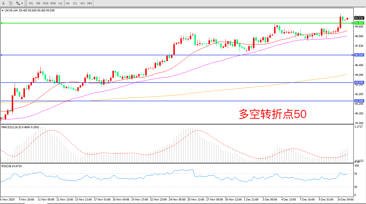 4小时图看,油价长阳拉升,强势突破前期整理区间,50美元成为中期多空分水岭,均线系统有拐头迹象,MACD红柱增加,RSI指标走平,日内延续上行概率较大。