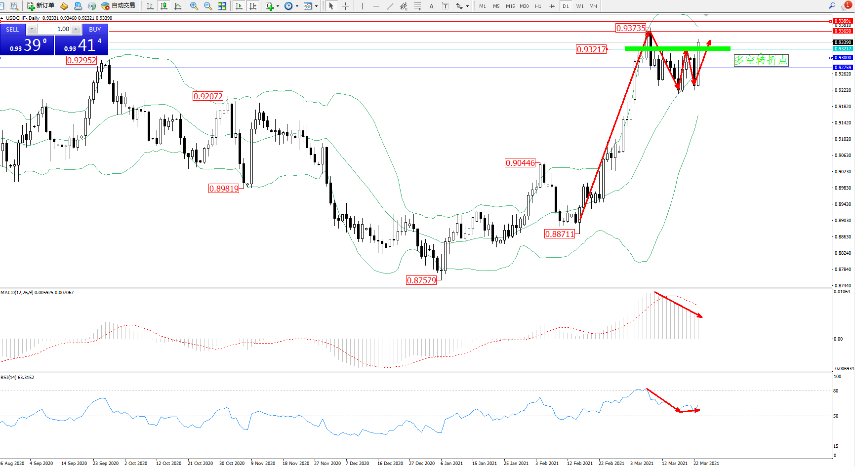 交易策略:0.93217上方看涨,目标0.93650、0.93891
