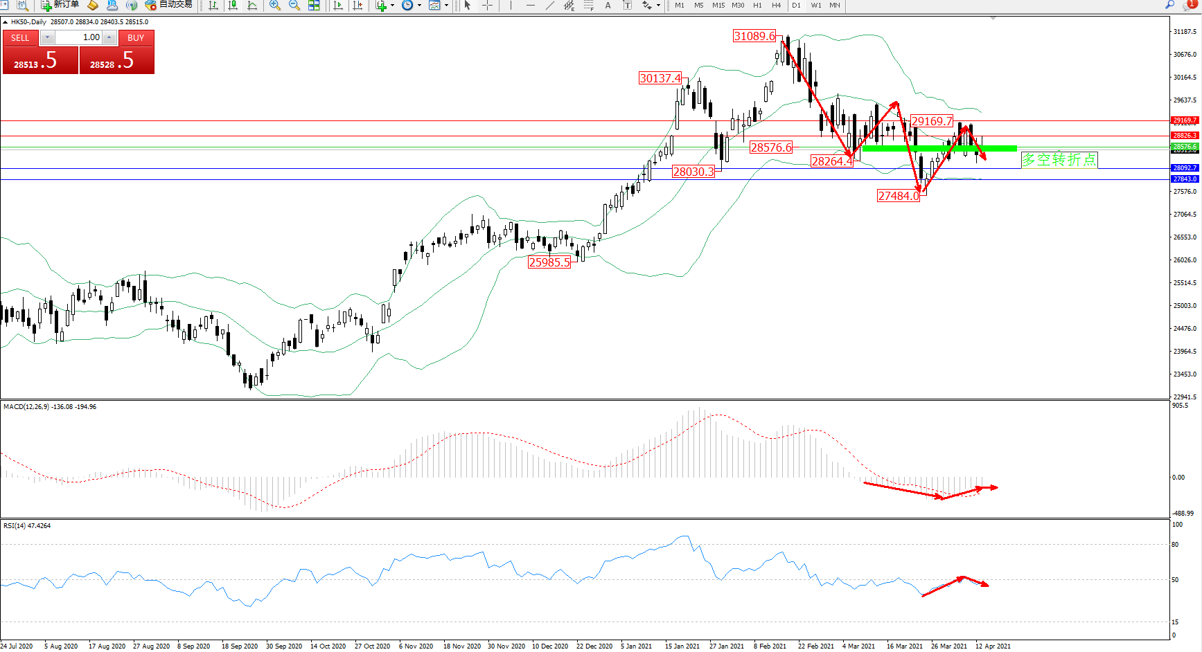 恒指HK50 ——日K线图显示: