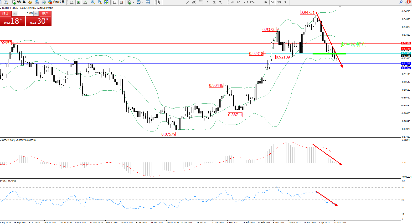 交易策略:0.92318下方看跌,目标0.91718、0.91453