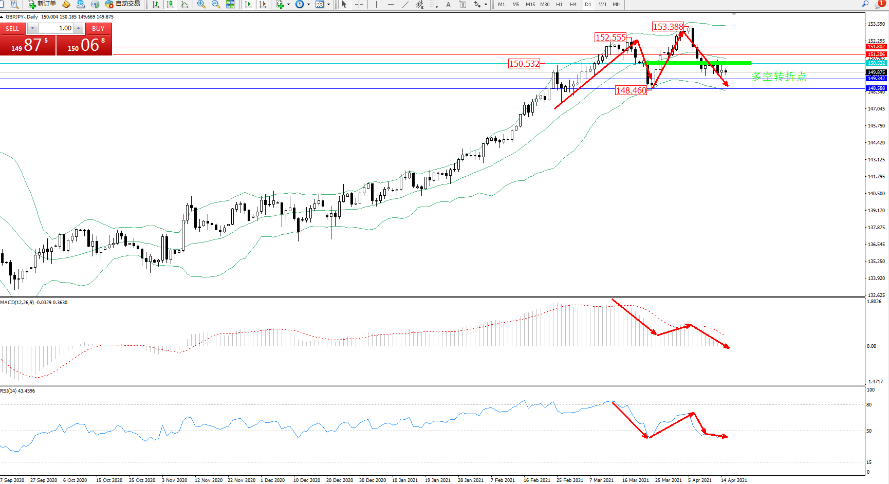 技术点评:多头动力延续布林带指标通道持续震荡上扬,高位抵达153.388位置节点遇阻回撤,急速下挫至中下轨区间震荡下行中,空头动力日渐强劲,布林带指标不断拉升上扬后,高位开始有反转平移走势,MACD指标处于多头区域持续震荡向下移动中,RSI指标高位急速下挫至0轴线下方徘徊;
