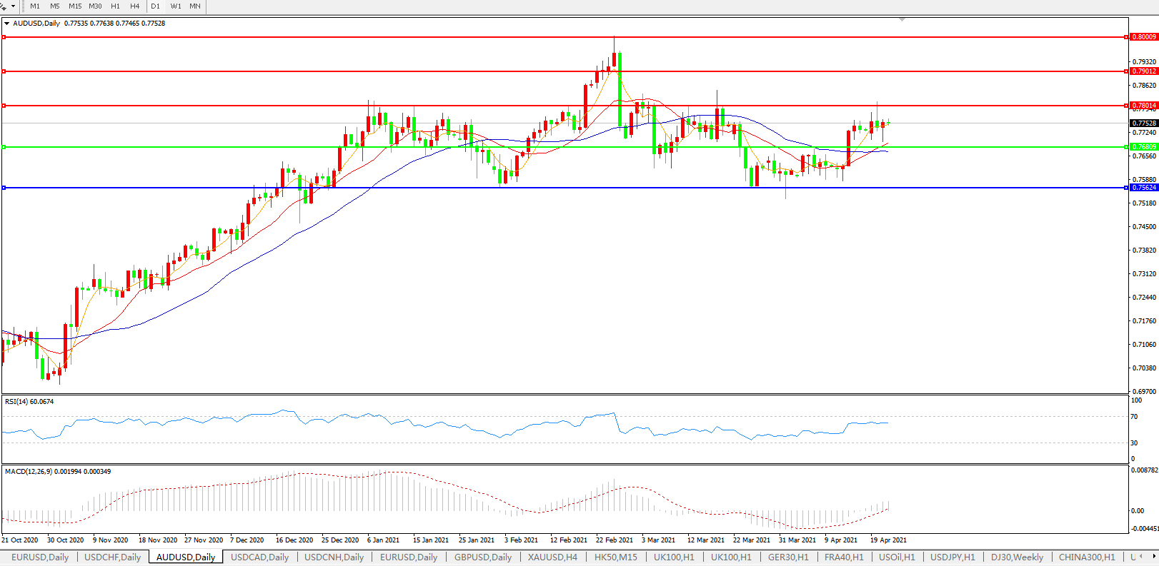 备选策略:0.7680下方看跌,目标0.7560、0.7400