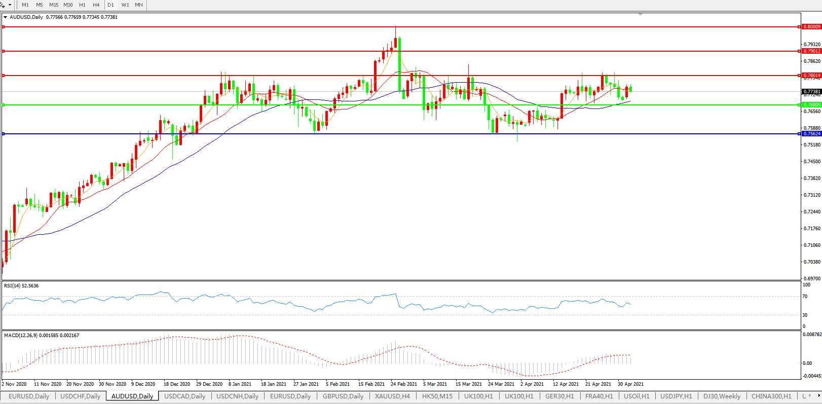 交易策略:0.7680上方看涨,目标0.7800、0.7900