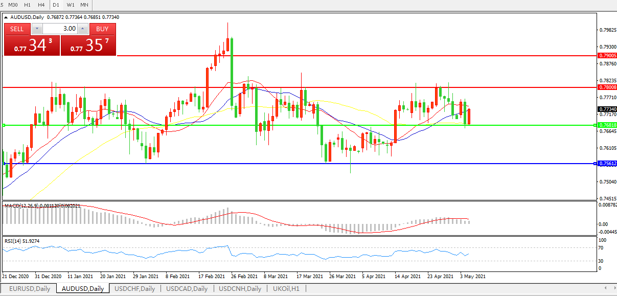 备选策略:0.7680下方看跌,目标0.7560、0.7400