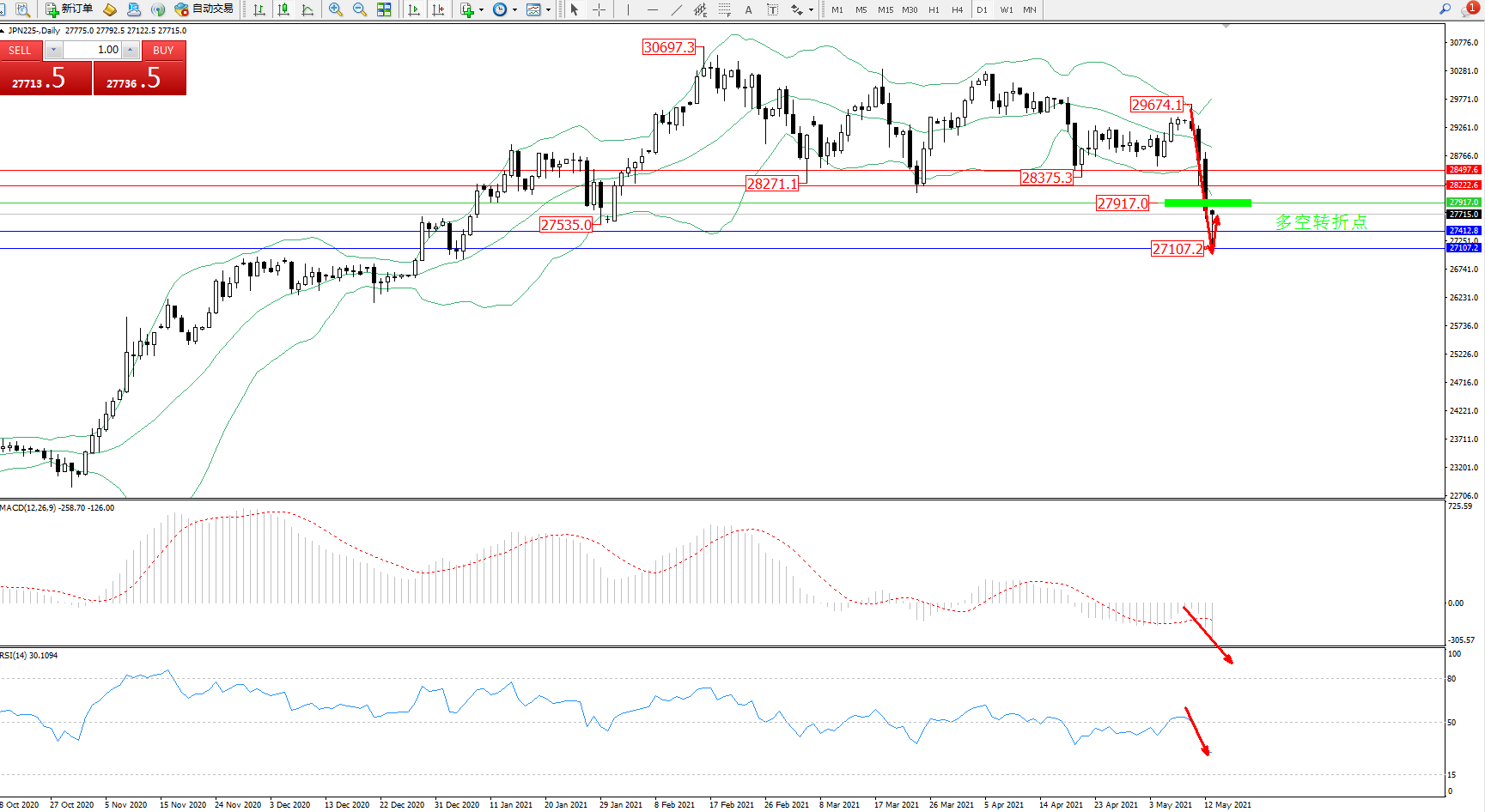 技术点评:长时间处于布林带指标通道宽幅震荡后,空头动力终究迎来破位下行走势,跌破布林带指标下轨附近节点至27107附近后快速反转回升,布林带指标呈缓慢张口走势持续中,MACD指标处于0轴线下方空头区域维持震荡不断向下移动中,RSI指标处于50均衡线附近震荡后急速下挫整理;
