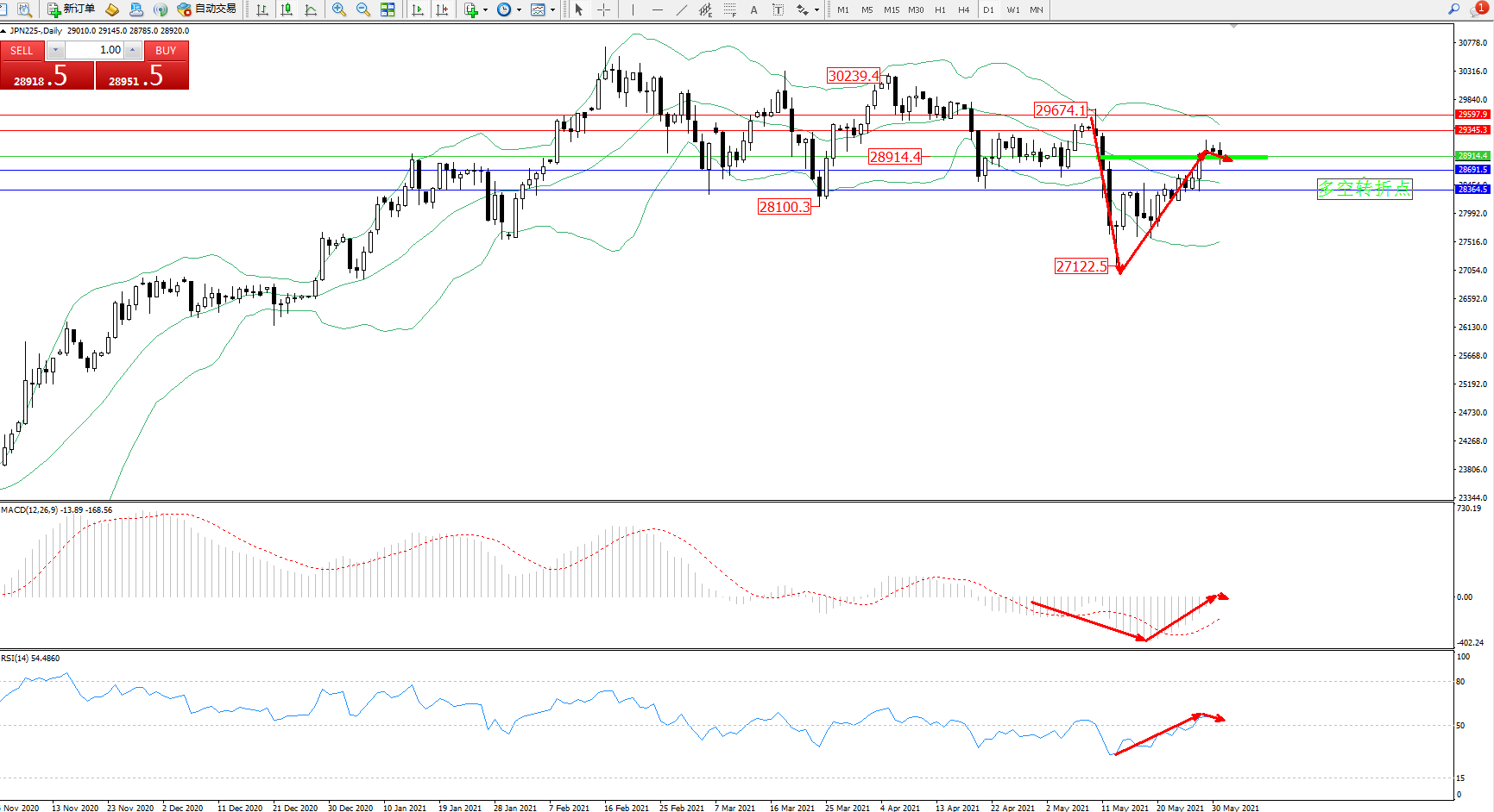 日经225指数5月31日(周一)收盘下跌286.91点,跌幅0.98%,报28862.50点。日本股市不会继续落后于欧美股市,虽然IT和通信在摩根士丹利资本国际(MSCI)日本指数中的权重大于MSCI欧洲指数和MSCI英国指数,但却远远小于MSCI美国指数,轮换交易应该对摩根士丹利资本国际日本指数(MSCI Japan Index)普遍利好,至少对MSCI美国指数利好;最近新冠病毒病例再次急剧增加;而且疫苗的推出一直缓慢,尽管如此,仍然认为情况会出现转机,坚持认为轮换交易在总体上还会进一步进行,虽然会变得更加微妙,怀疑摩根士丹利资本国际日本指数将继续表现逊于其他指数,从现在到2022年年底,预计该指数的累计价格涨幅将达到17%,日本央行5月份没有购买ETF,为日本央行行长黑田东彦2013年执掌以来首次整月未介入市场。数据凸显出该央行正在逐渐从黑田东彦的“火箭筒”刺激计划逐步撤退,因为多年来的大量资产购买招致抨击,批评者认为此举扭曲了市场并使日本央行的资产负债表充满风险。在3月对政策工具的审查中,日本央行宣布放弃ETF购买速度的数字目标,并承诺只有在市场压力严重时才会介入市场。