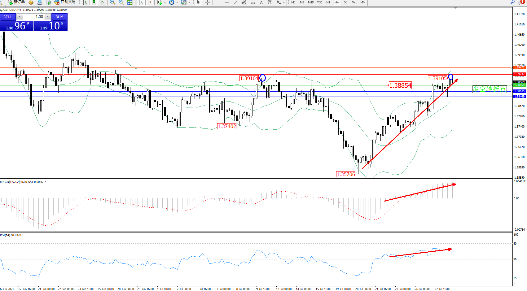 技术点评:多头动力延续布林带指标通道中上轨区间持续震荡上扬,高位抵达1.39105附近震荡,此前高位1.39104位置短暂破位,布林带指标呈上行趋势态势良好,MACD指标处于多头区域维持徘徊上移中,RSI指标处于多头区域高位整理平移;