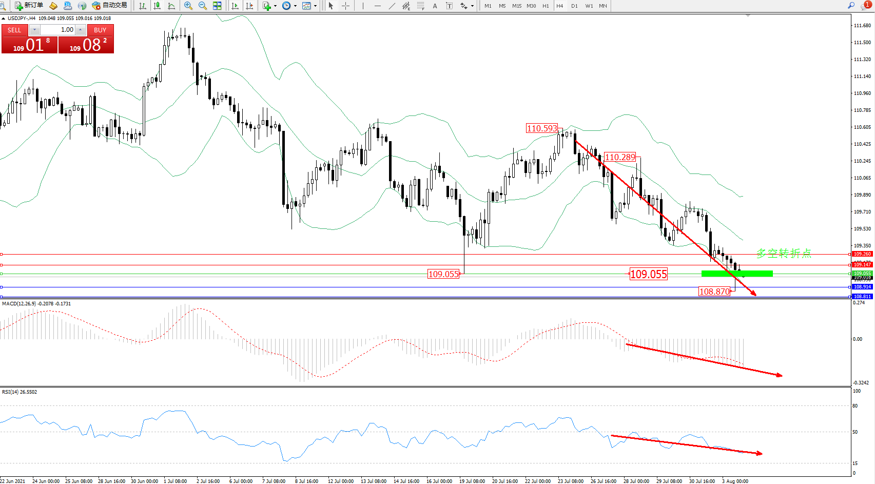 交易策略:109.055下方看跌,目标108.914、108.811