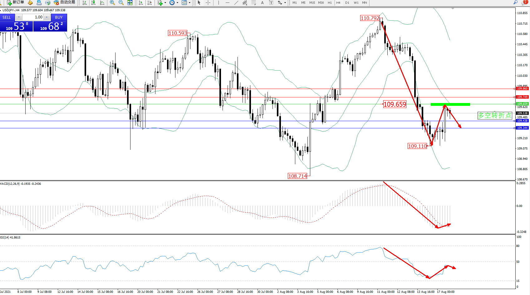 技术点评:空头动力延续布林带指标通道下轨附近持续震荡下行,低位抵达109.110位置得到短暂支撑开始整理后拉升上移,即将触及布林带指标中轨附近节点后短期遇阻回撤,空头动力依旧有继续向下移动态势,布林带指标呈张口走势后开始收口,MACD指标处于空头区域低位震荡缓慢上移,RSI指标处于空头区域震荡缓慢上移后整理;