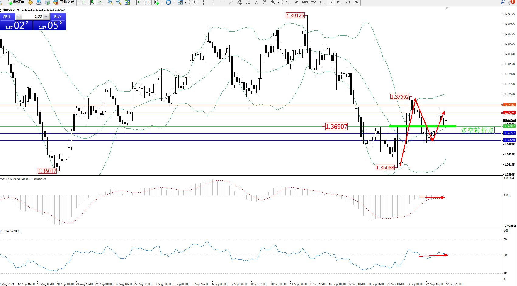 交易策略:1.36907上方看涨,目标1.37174、1.37332
