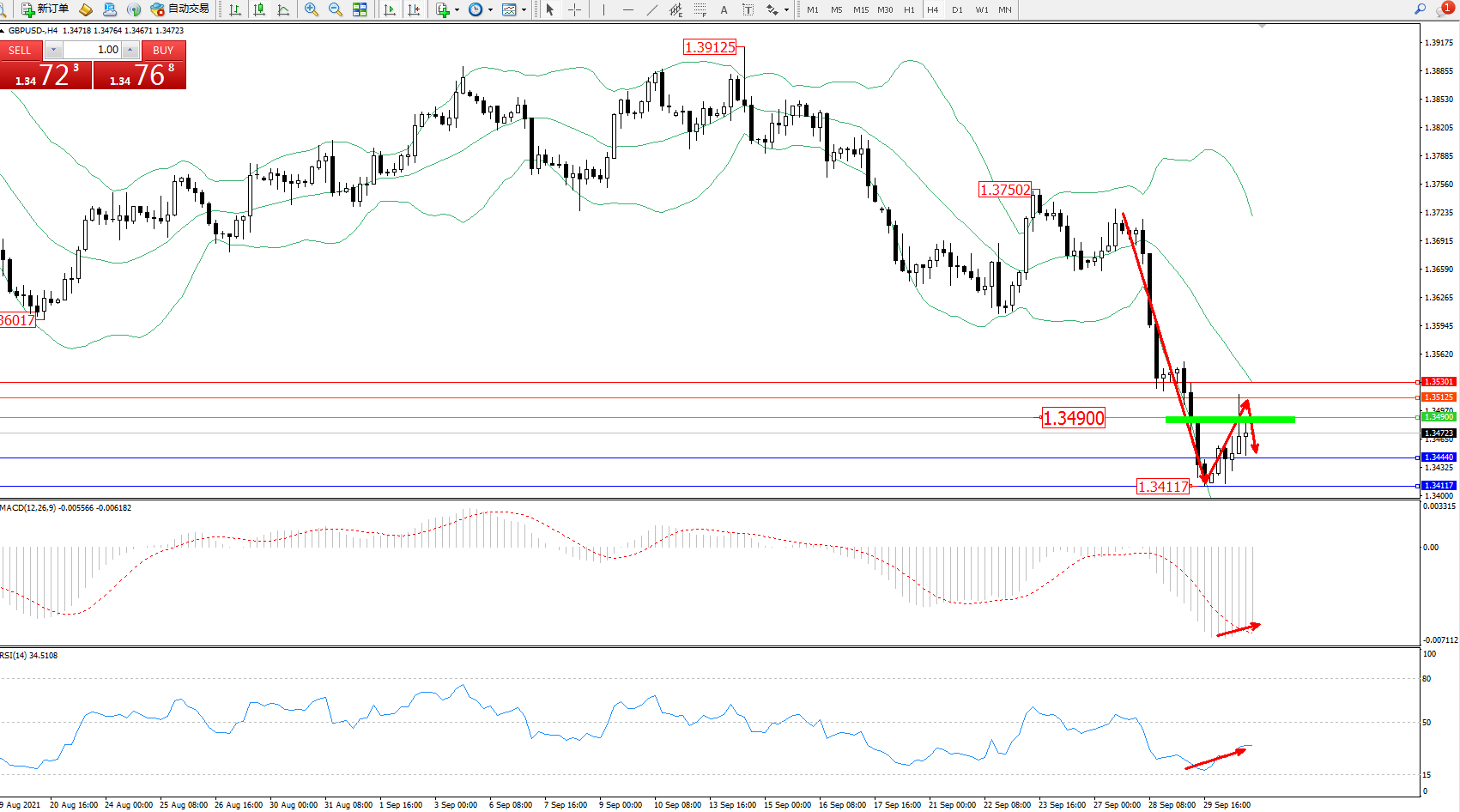 交易策略:1.34900下方看跌,目标1.34440、1.34117