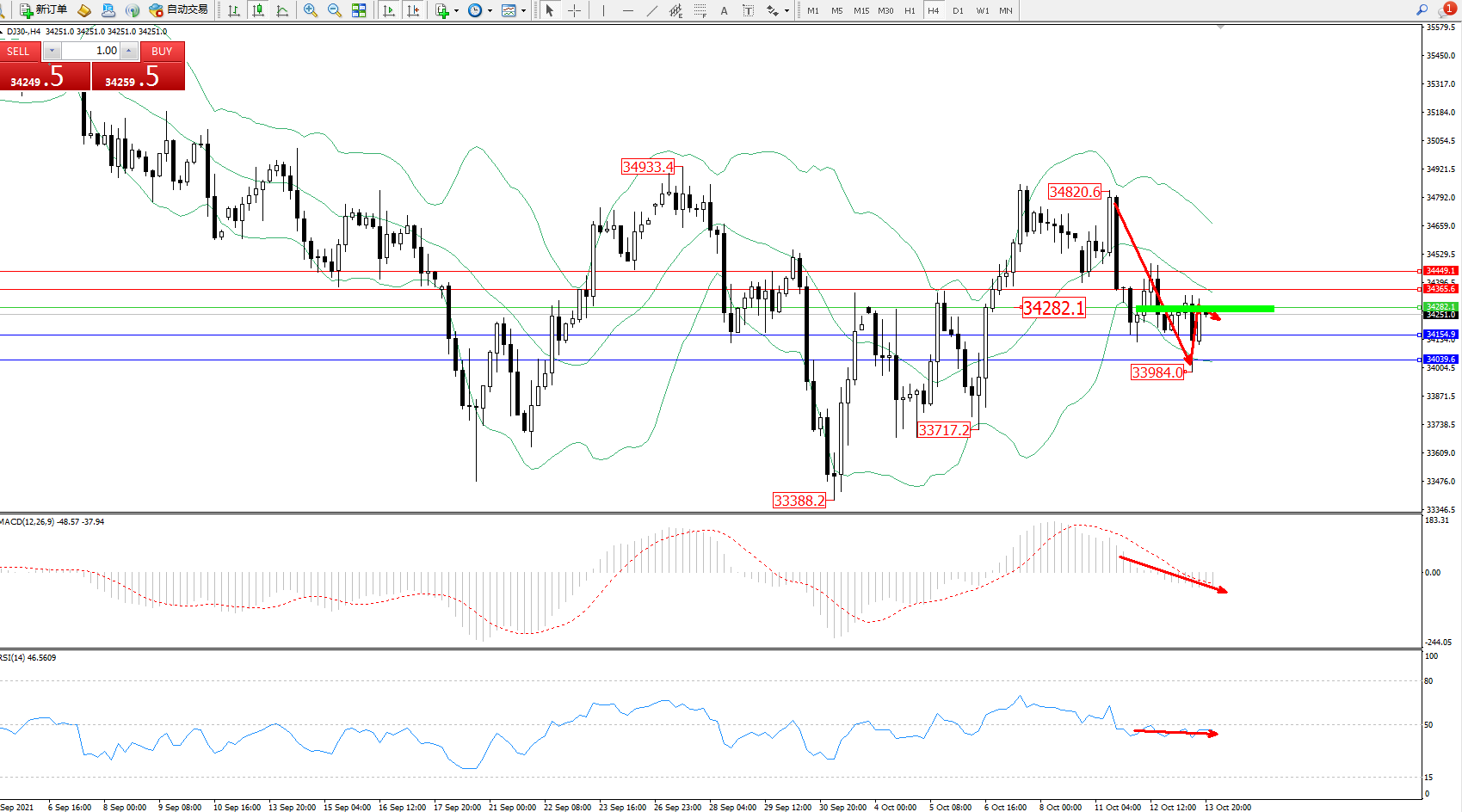 道琼斯指数DJ30——4小时K线图显示: