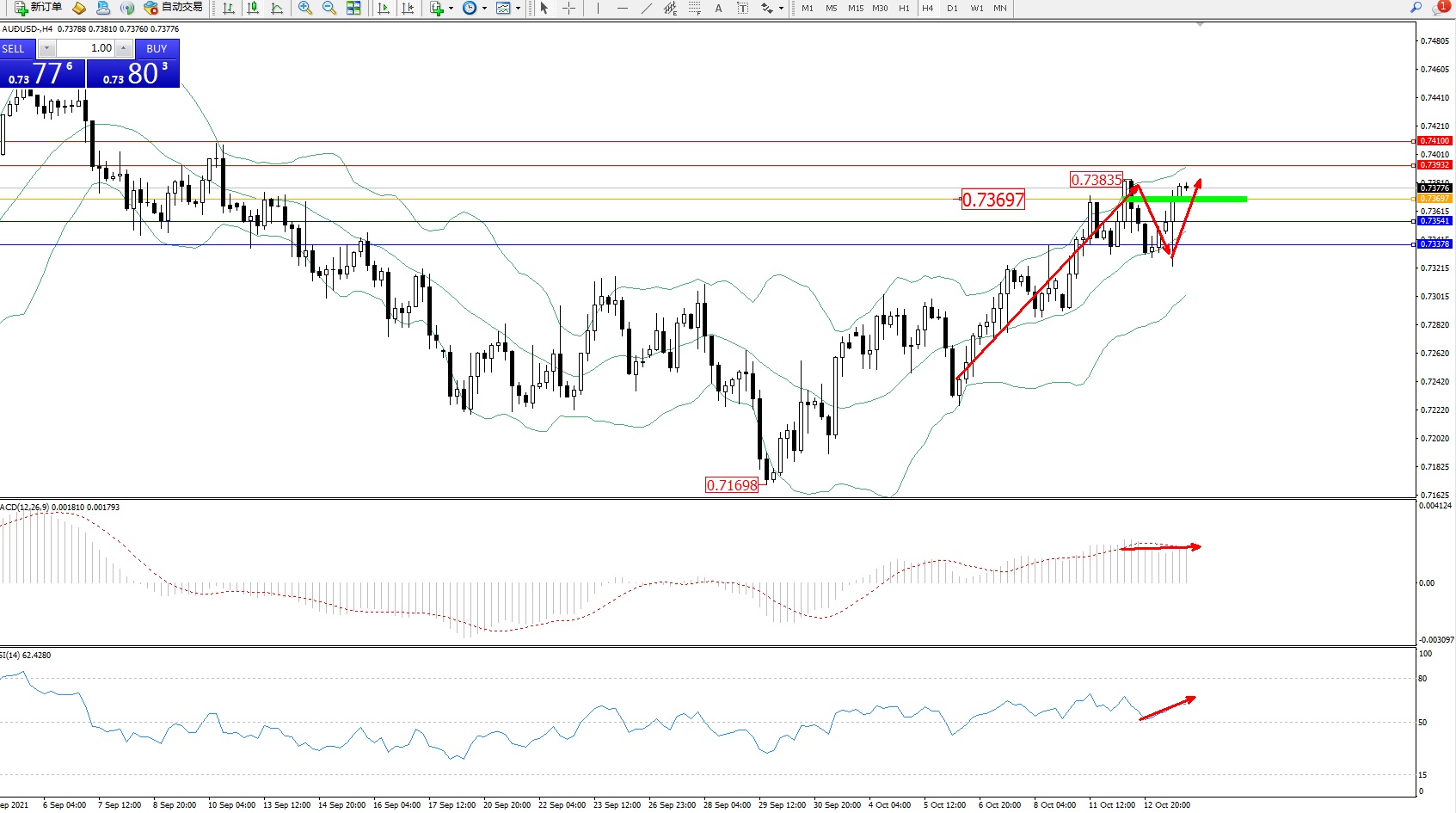 交易策略:0.73697上方看涨,目标0.73932、0.74100