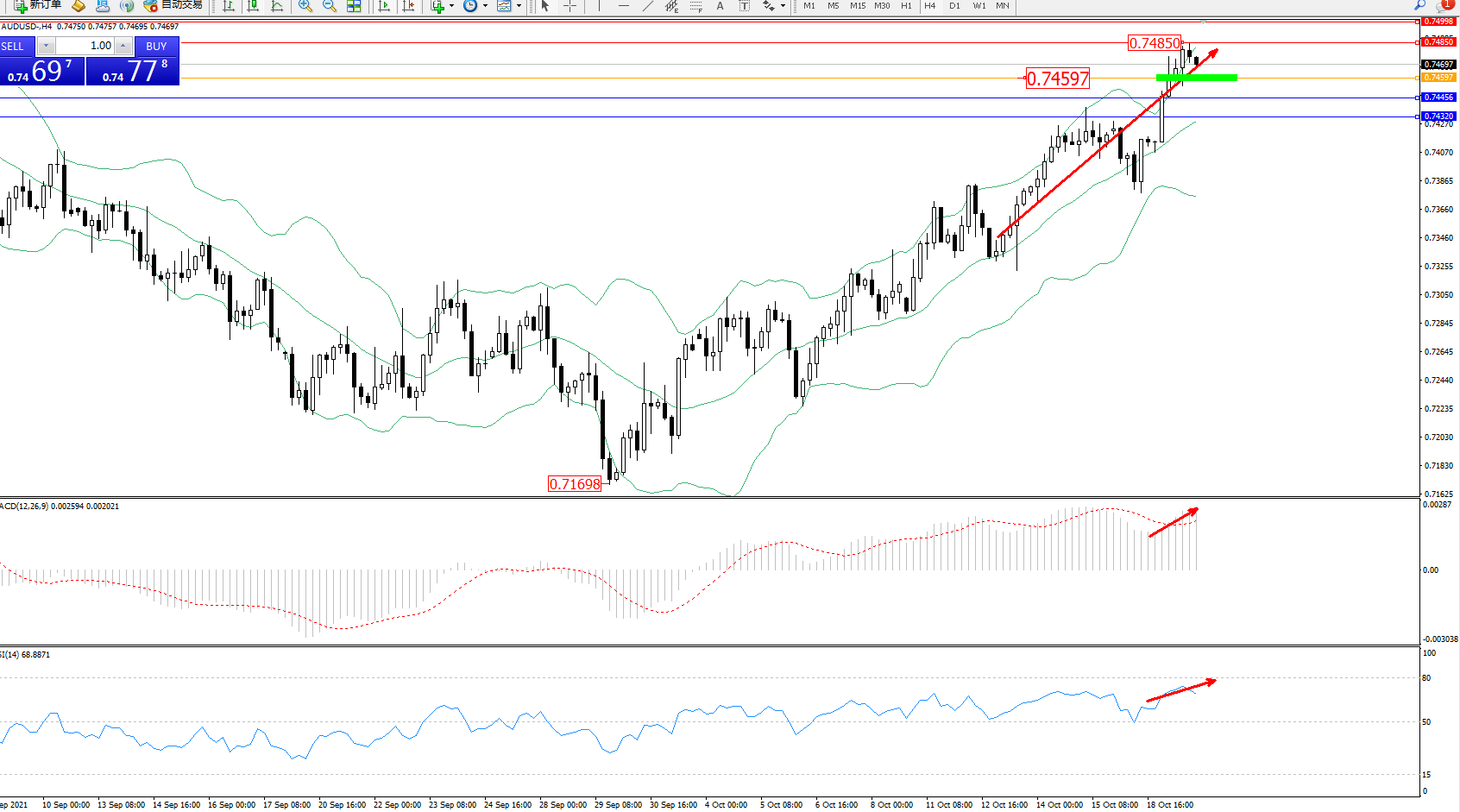 交易策略:0.74597上方看涨,目标0.74850、0.74998